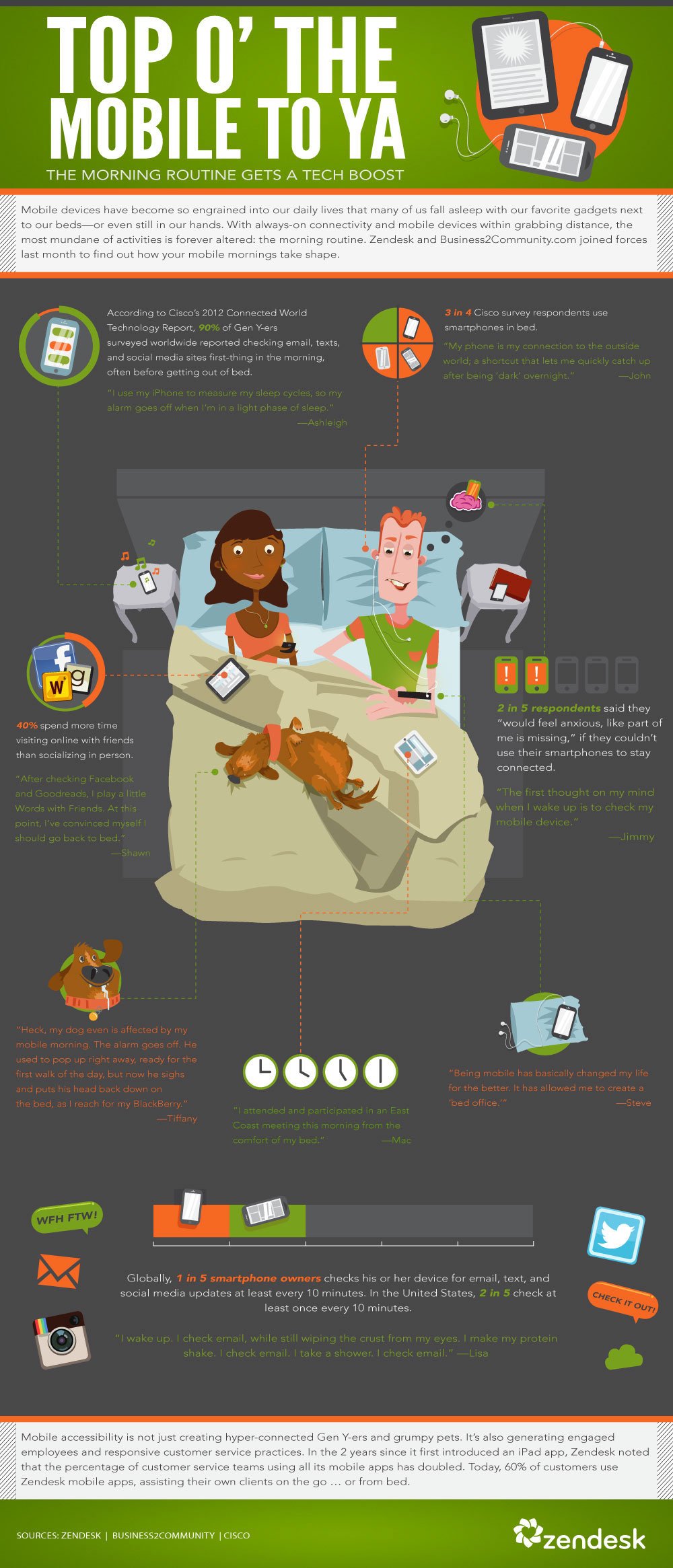 The infographic "Top O' The Mobile To Ya: The Morning Routine Gets a Tech Boost" explores how mobile devices have become integral to our daily lives, especially during the morning routine. It is based on findings from Cisco's 2012 Connected World Technology Report and a collaboration between Zendesk and Business2Community.com.